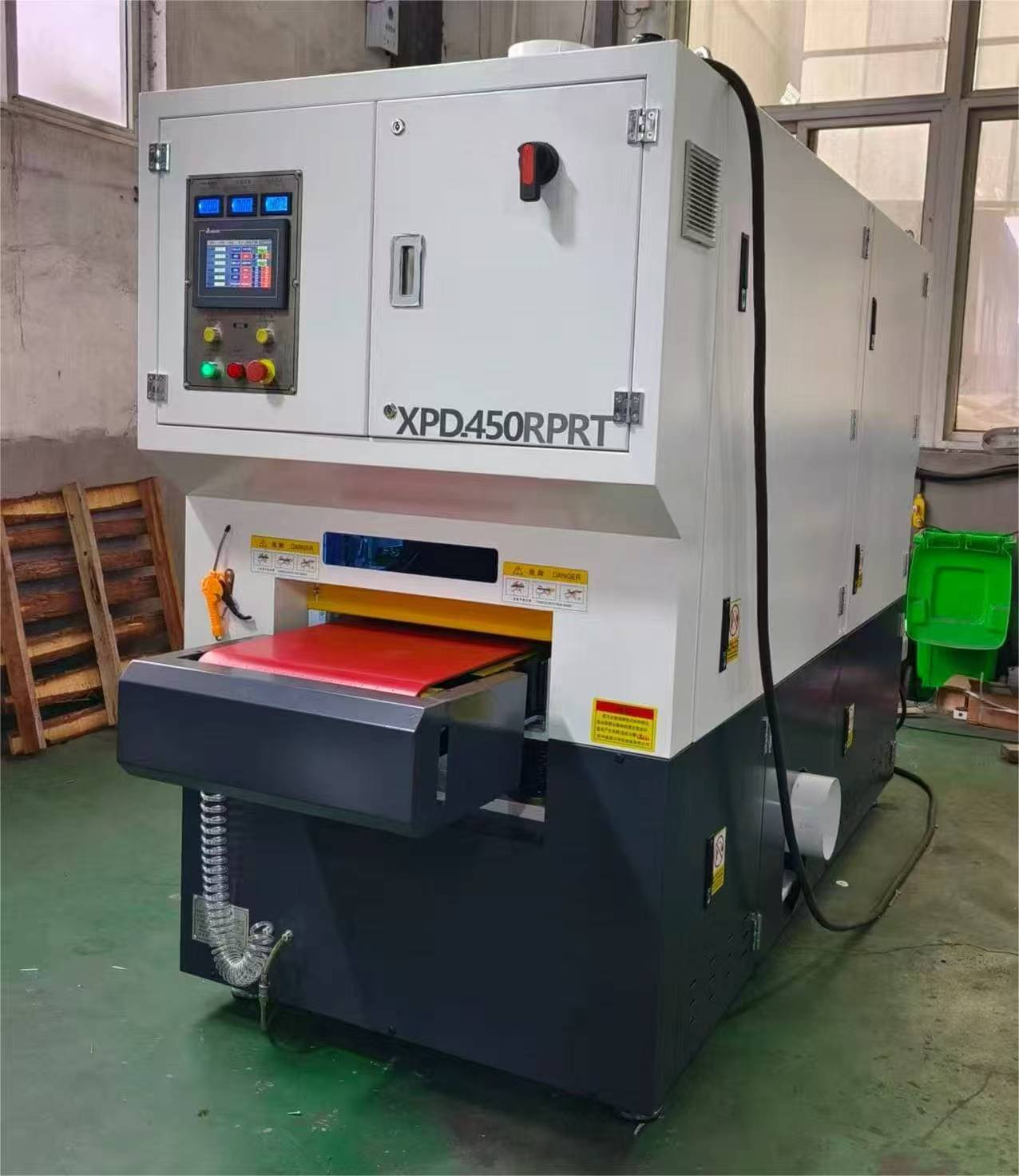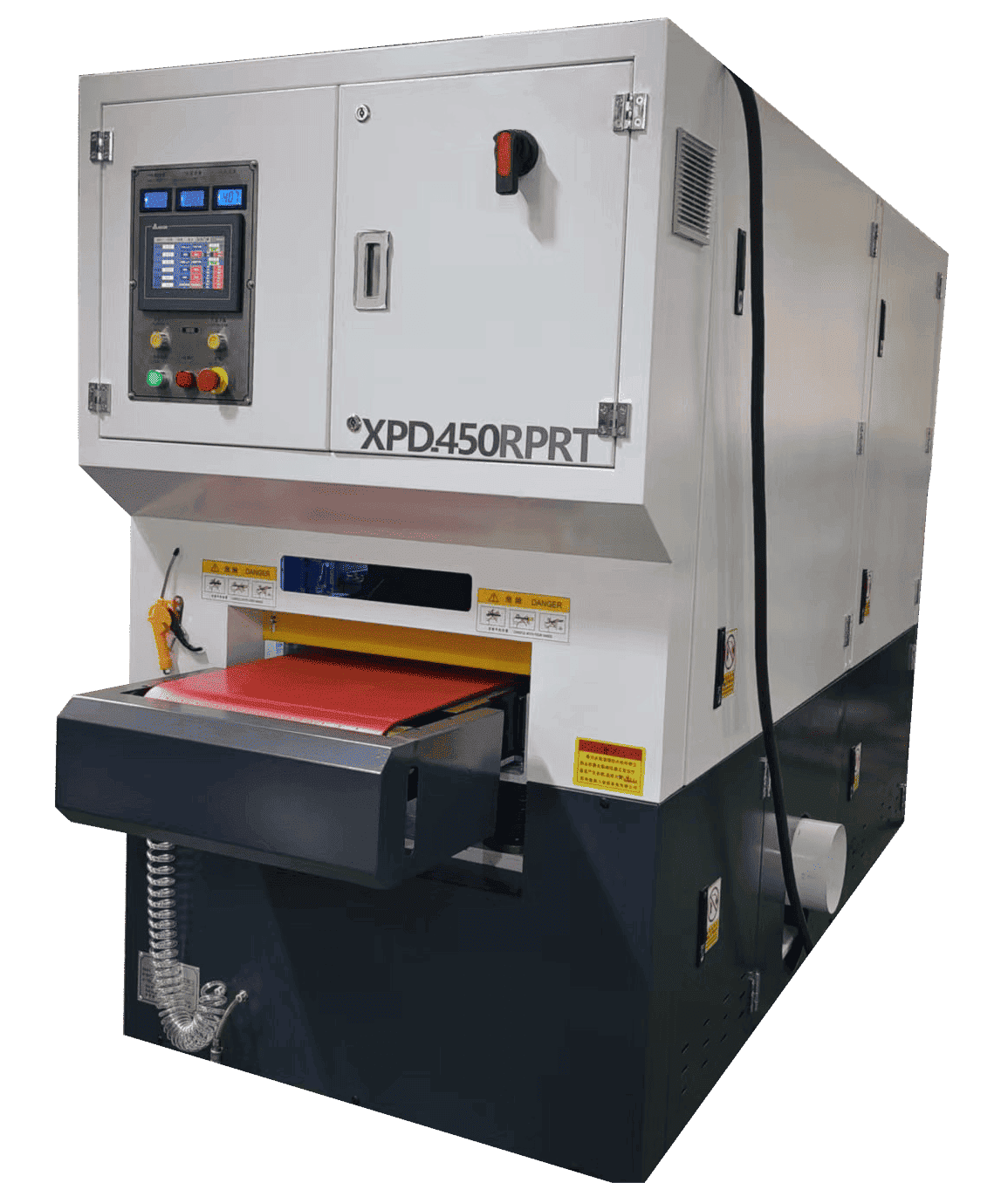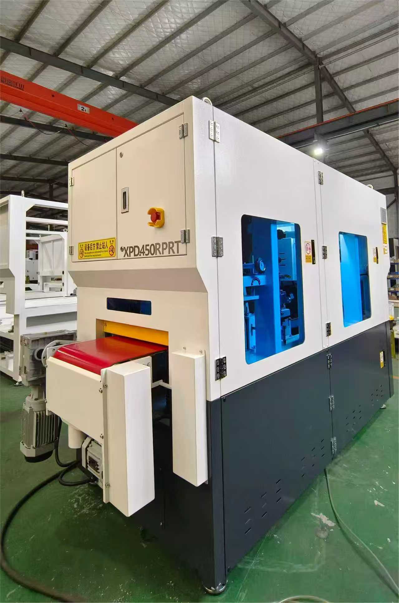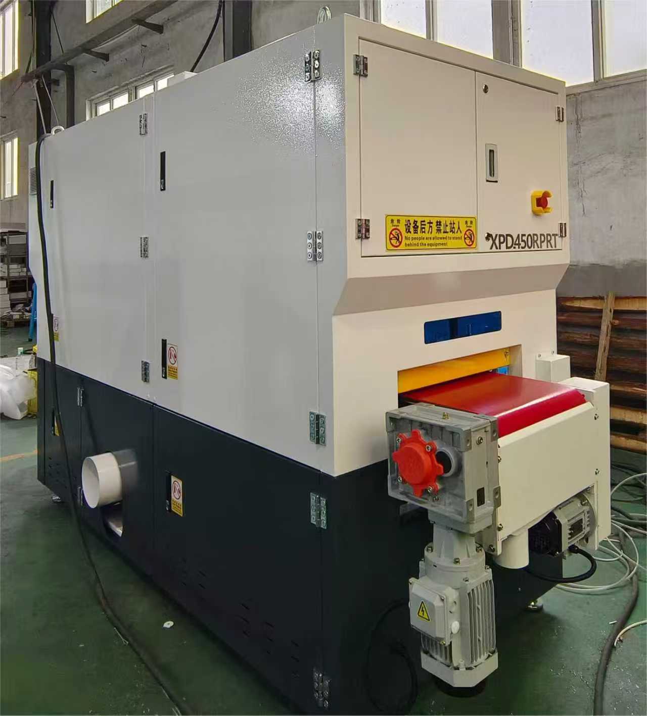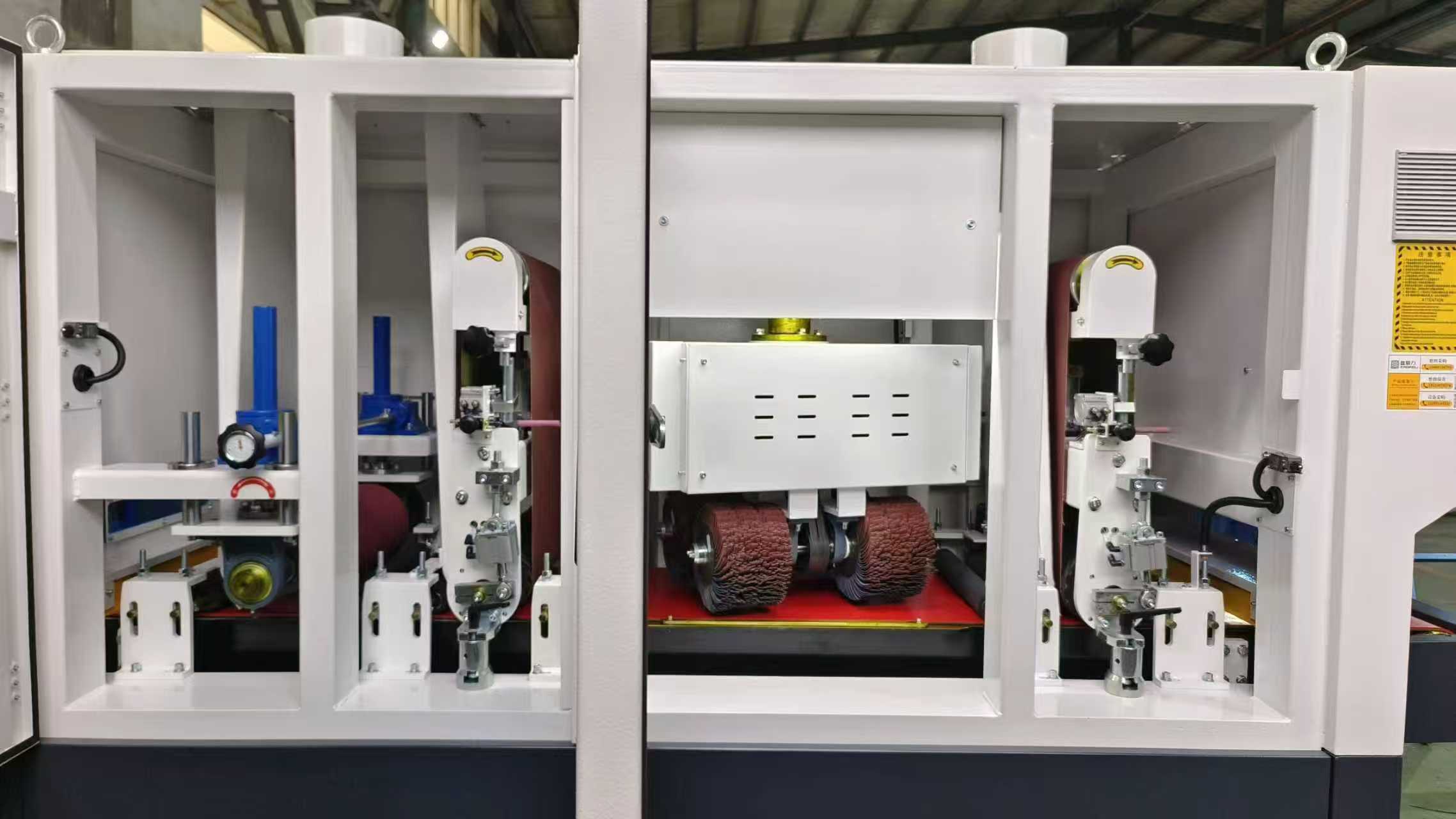 يتكون الهيكل الداخلي لـ 450RPRT من مجموعة واحدة من الحزام الكاشطة + أربع فرش أسطوانية + مجموعة واحدة من الحزام الكاشطة + أسطوانة تلميع واحدة، مما يشكل نظام معالجة من أربع مراحل. يتم استخدام الحزام الكاشطة الأول في الإزالة الأولية للنتوءات من سطح قطعة العمل؛ المرحلة الثانية مع أربع فرش دوارة تنفذ معالجة بالفرشاة، مما يضمن إزالة الأزيز دون الإضرار بالسطح؛ توفر المجموعة الثانية من الأحزمة الكاشطة مزيدًا من الطحن الدقيق لتحسين تسطيح السطح؛ وأخيرًا، تقوم أسطوانة التلميع بإجراء تلميع دقيق، مما يجعل السطح أملسًا وموحدًا ومصقولًا بصريًا. بفضل هيكلها المصمم جيدًا، فإن ماكينة تشطيب المعادن تمكن من معالجة الأسطح بكفاءة، وثبات، ومستمر.