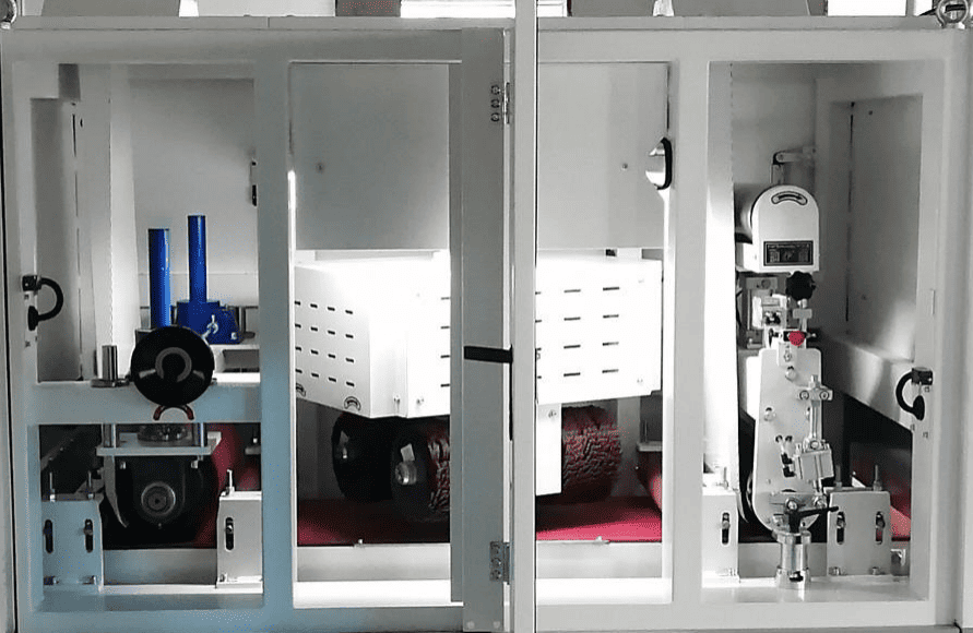 يتكون الهيكل الداخلي لـ 800RPT من مجموعة واحدة من الأحزمة الكاشطة + أربع فرش أسطوانية + أسطوانة تلميع واحدة، ونظام معالجة التشكيل. يتم استخدام الحزام الكاشطة الأول في الإزالة الأولية للنتوءات من سطح قطعة العمل؛ المرحلة الثانية مع أربع فرش دوارة تقوم بإجراء معالجة بالفرشاة، مما يضمن إزالة الأزيز بشكل كامل دون الإضرار بالسطح؛ وأخيرًا، تقوم أسطوانة التلميع بإجراء تلميع دقيق، مما يجعل السطح أملسًا وموحدًا ومصقولًا بصريًا. بفضل هيكلها المصمم جيدًا، فإن ماكينة تشطيب المعادن تمكن من معالجة الأسطح بكفاءة، وثبات، ومستمر.